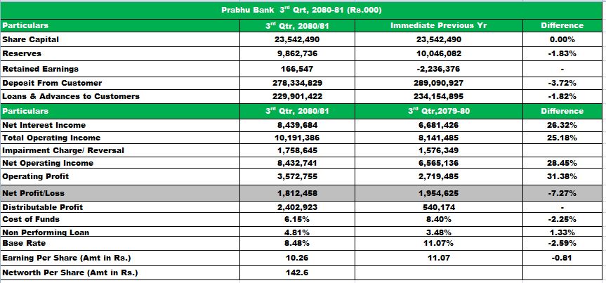 अघिल्लो वर्ष यसले १ अर्ब ९५ करोड ४६ लाख २५ हजार रुपैयाँ खुद नाफा कमाएको थियो । एक वर्षको अवधिमा प्रभुको खराब कर्जा १.३३ प्रतिशतले बढेर ४.८१ प्रतिशत पुगेको छ ।