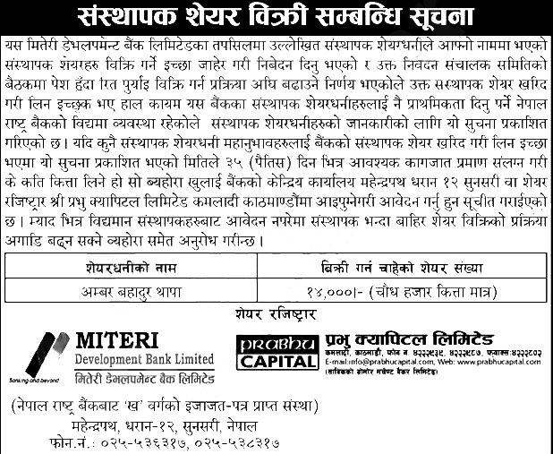 मितेरी डेभलपमेन्ट बैंकको १४ हजार कित्ता संस्थापक शेयर बिक्रीमा
