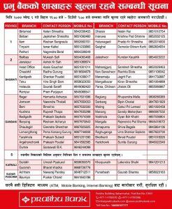 प्रभु बैंकको आज मिति २०७७ जेठ ६ गते मंगलबार खुल्ने शाखाहरु