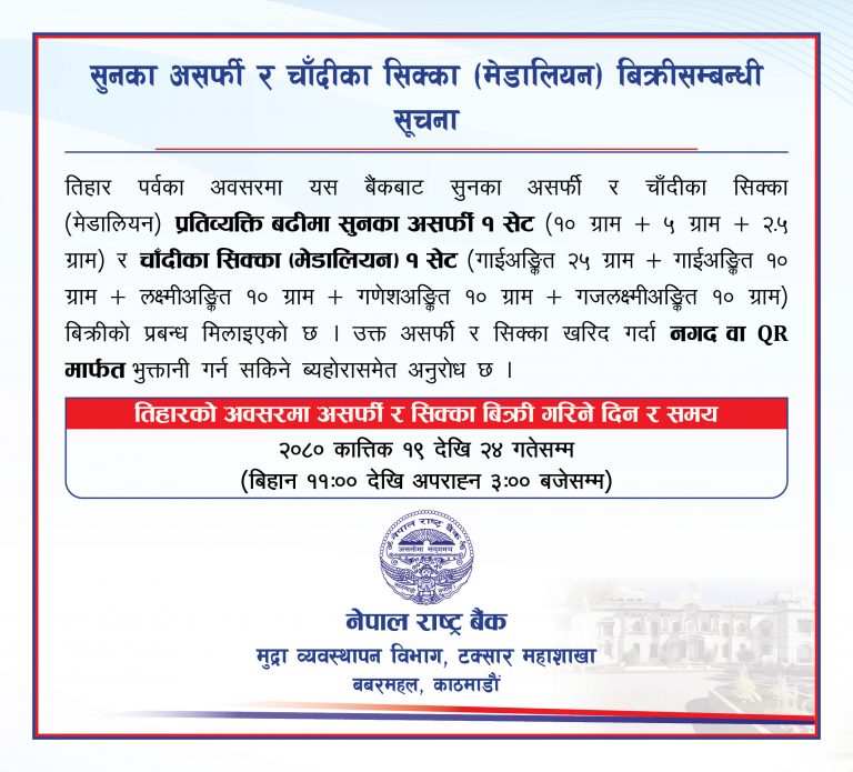 काठमाडौं । नेपाल राष्ट्र बैंकले तिहारलाई लक्षित गर्दै कात्तिक १९ गतेदेखि सुनको असर्फी र चाँदीको (मेडालियन) सिक्का बिक्री गर्ने भएको छ ।