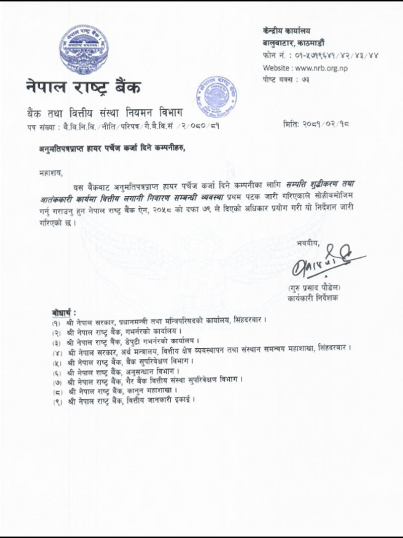 काठमाडौं । नेपाल राष्ट्र बैंकले हायर पर्चेज कर्जा दिने कम्पनीको लागि सम्पत्ति शुद्धीकरण तथा आतङ्ककारी कार्यमा वित्तीय लगानी निवारण सम्बन्धी पहिलो पटक नीतिगत व्यवस्था गरेको छ ।