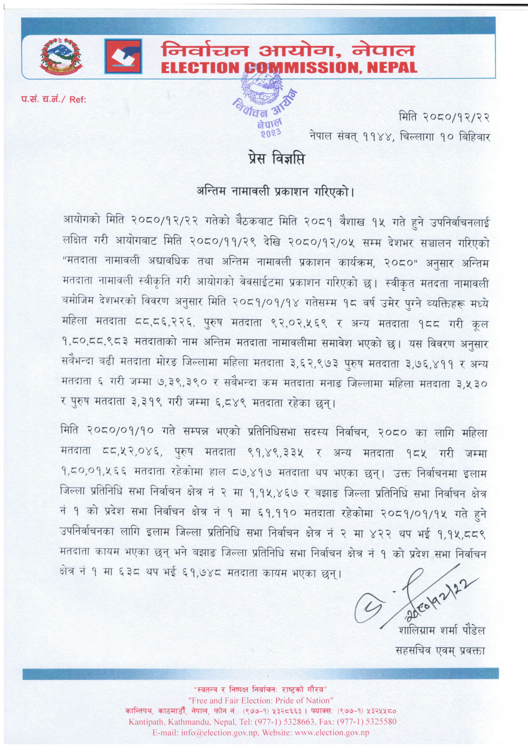 स्वीकृत मतदाता नामावली बमोजिम देशभरको विवरण अनुसार मिति २०८१–०१–१४ गतेसम्म १८ वर्ष उमेर पुग्ने व्यक्तिहरू मध्ये महिला मतदाता ८८ लाख ८६ हजार २२६, पुरुष मतदाता ९२ लाख दुई हजार ५६९ र अन्य मतदाता १८८ गरी कूल एक करोड ८० लाख ८८ हजार ९८३ मतदाताको नाम अन्तिम मतदाता नामावलीमा समावेश भएको छ ।