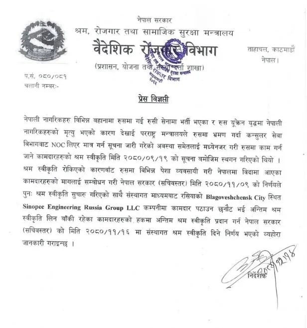 वैदेशिक रोजगार विभागले श्रम स्वीकृति र पुनः श्रम स्वीकृति दिने निर्णय सार्वजनिक गरिरहँदा श्रममन्त्री डोलप्रसाद अर्यालले भने रुसमा व्यक्तिगत श्रम स्वीकृति खुला नगरिरहेको भन्दै भाषण गरिरहेका थिए । त्यहीबेला विभागले फागुन ९ र १६ गते श्रम सचिवले निर्णय गरेको भन्दै विज्ञप्ति सार्वजनिक गरेको थियो ।