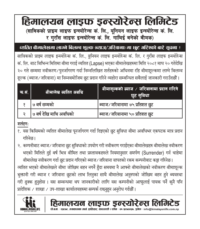हिमालयन लाइफले व्यतित बीमालेखमा लाग्ने बिलम्ब शुल्कमा ७५% छुट दिने