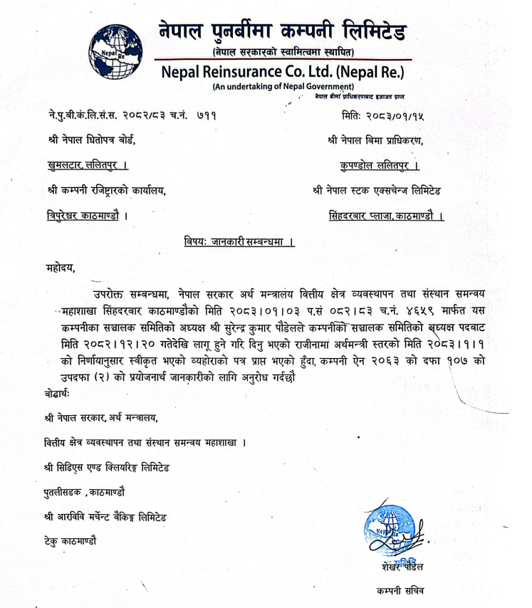 काठमाडौं । नेपाल पुनर्बिमा कम्पनीको सञ्चालक समिति अध्यक्षबाट सुरेन्द्र कुमार पौडेलले राजीनामा दिएका छन् ।