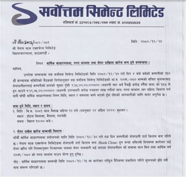 साधारण सभा र लाभांश वितरण प्रयोजनका लागि सर्वोत्तमले चैत ३० गते शुक्रबार एक दिन बुक क्लोज गर्ने भएको छ ।