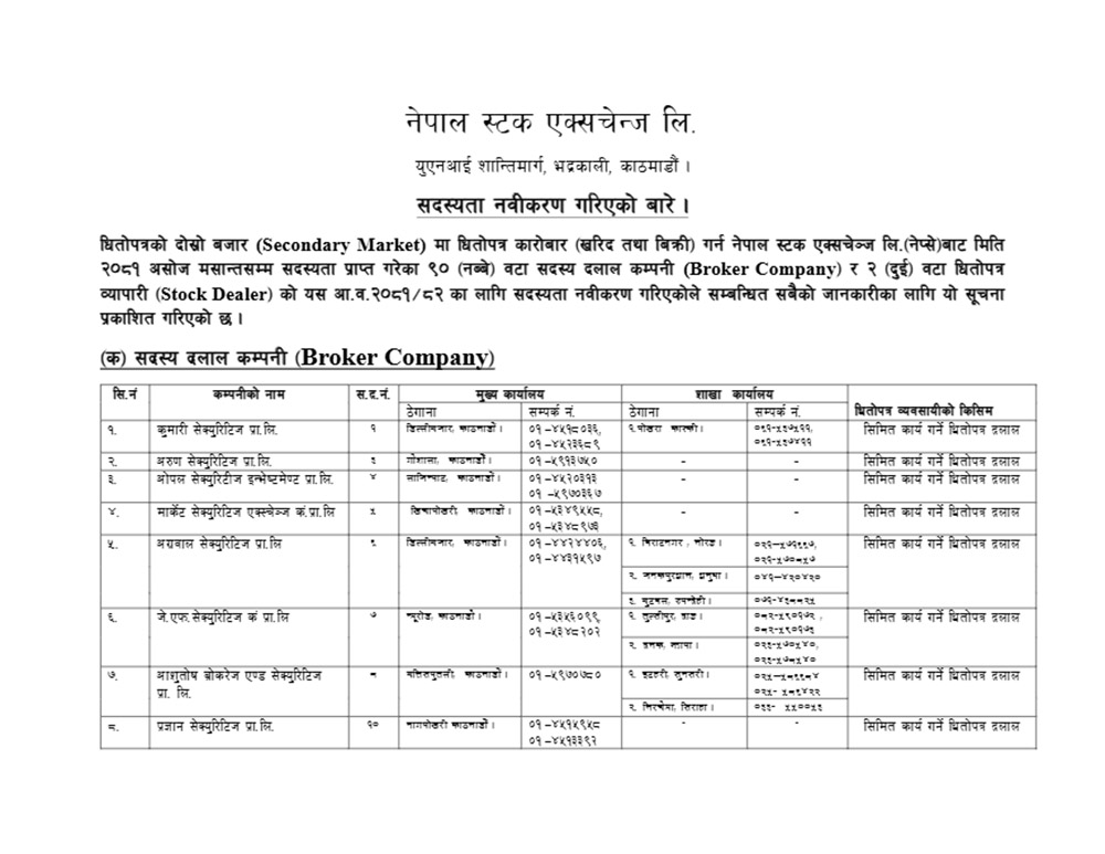 नेप्सेले एक सूचना प्रकाशित गर्दै आर्थिक वर्ष २०८१/८२ का लागि ब्रोकर र स्टक डिलरको सदस्यता नवीकरण गरेको जानकारी गराएको हो। धितोपत्र दोस्रो बजारमा शेयर कारोबार (खरिद र बिक्री) गर्न ती ब्रोकर र स्टक डिलरको सदस्यता नवीकरण गरिएको नेप्सेले जनाएको छ।