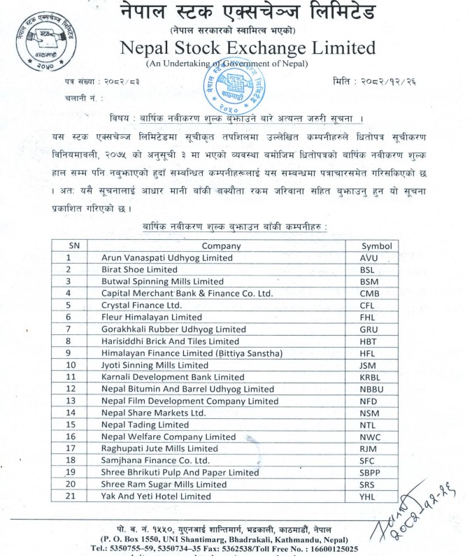धितोपत्रको वार्षिक नवीकरण शुल्क हालसम्म नबुझाएका कम्पनीहरुलाई बाँकी बक्यौता रकम जरिवानासहित बुझाउन नेप्सेले सुझाएको हो ।