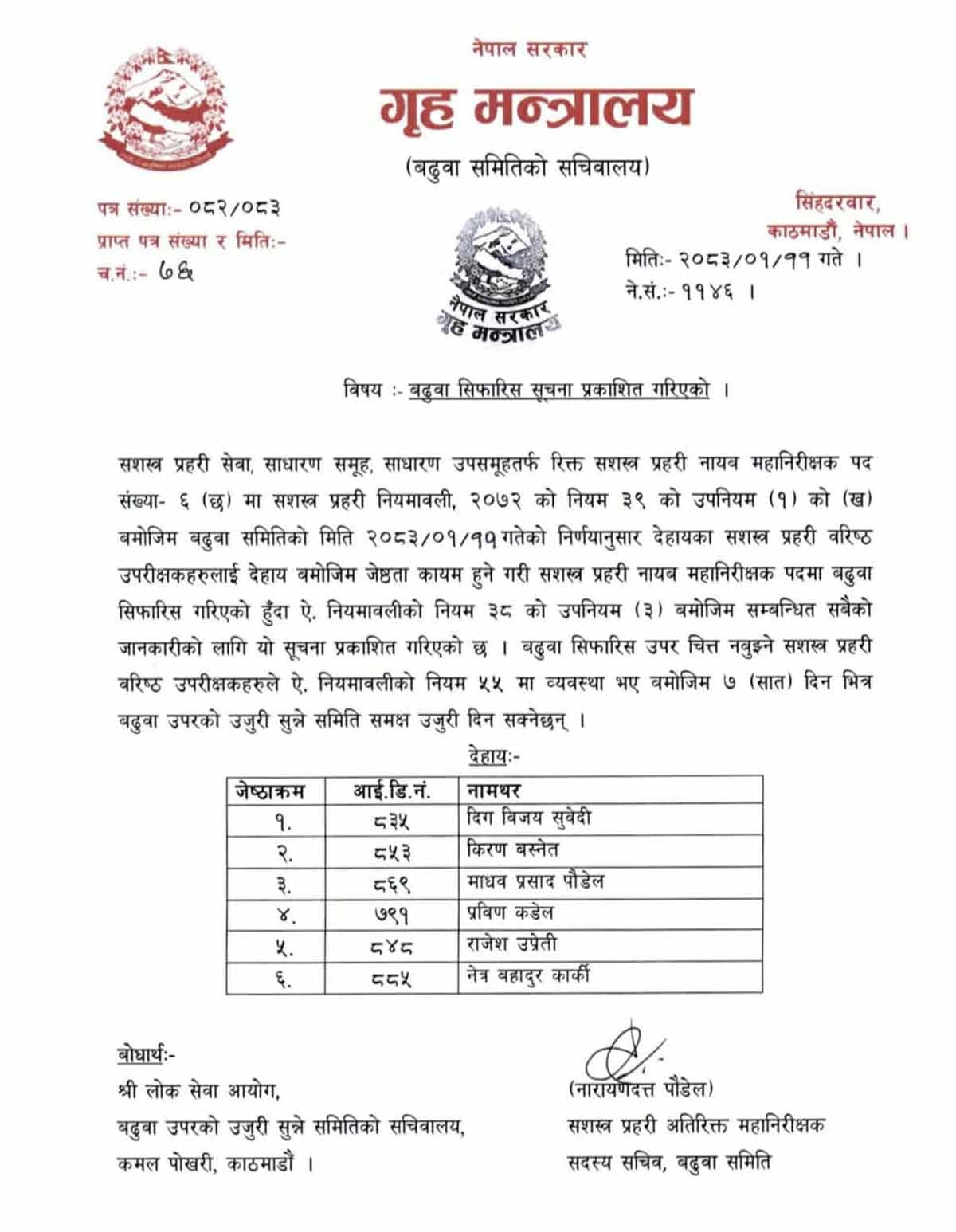 सशस्त्रका ६ एसएसपी डीआईजी बढुवाका लागि सिफारिस