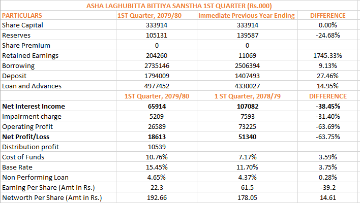 लघुवित्तले इम्पेयरमेन्ट चार्ज बापत ५२ लाख रुपैयाँ छुट्याएको छ । आशाको चुक्ता पुँजी ३३ करोड ३९ लाख १४ हजार रुपैयाँ छ । जगेडा कोषमा १० करोड ५१ लाख रुपैयाँ जम्मा भएको छ ।