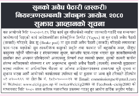 काठमाडौँ । सुनको अवैध पैठारी नियन्त्रणसम्बन्धी जाँचबुझ आयोगले ब्रेक शु, इलेक्ट्रिक सिगरेट लगायतका माध्यममार्फत भएका सुन तस्करीसम्बन्धी जानकारी भएमा कात्तिक मसान्तसम्म आयोगको कार्यालयलाई जानकारी दिन आग्रह गरेको छ ।