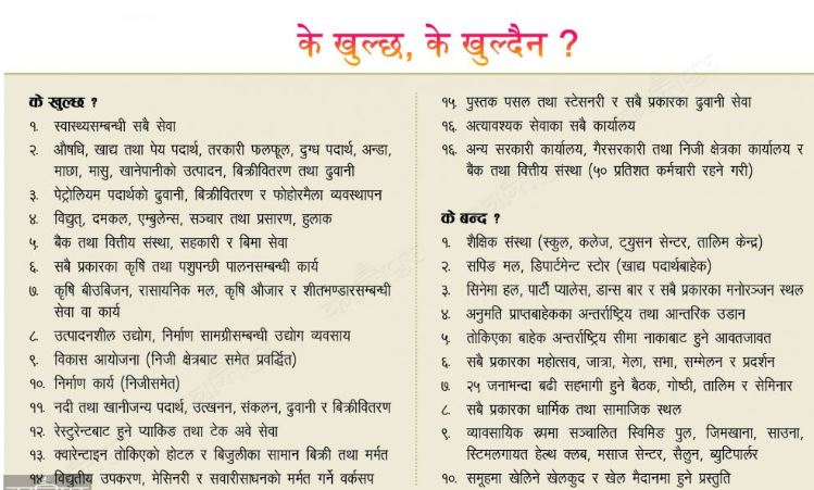 किराना लयागत अन्य अत्यावश्यक सामग्रीका पसल भने यसअघि पनि बिहान खुलै हुने गर्थे । बिहीबार सडक किनारमा ट्याक्सी समेत तयारी अवस्थामा राखिएका देखिएकाे छ । निणर्यानुसार दुई पांग्रेमा १ जना, चार पांग्रेमा ड्राइभरसहित ३ जना मात्रै सवार हुन पाउने भएको छ । तर लामो दूरीका सवारी भने तत्काल खुल्ने छैनन् । साथै शैक्षिक संस्थाहरू (स्कुल, कलेज), रेस्टुरेन्ट, पार्टी प्यालेस, सिनेमा हल, शपिङ मलजस्ता बढी भीडभाड हुने क्षेत्र पनि तत्काल खोल्पन पाइने छैन । महोत्सव, जात्रा, कार्यक्रम पनि गर्न पाइने छैन । अन्तर्राष्टिय उडान समेत खुल्ने छैनन् । गत चैत ११ गतेबाट सुरू भएको लकडाउन ७८ दिनपछि खुकुलो बनाउने निर्णय बुधबारको मन्त्रिपरिषद बैठकले गरेको हो ।