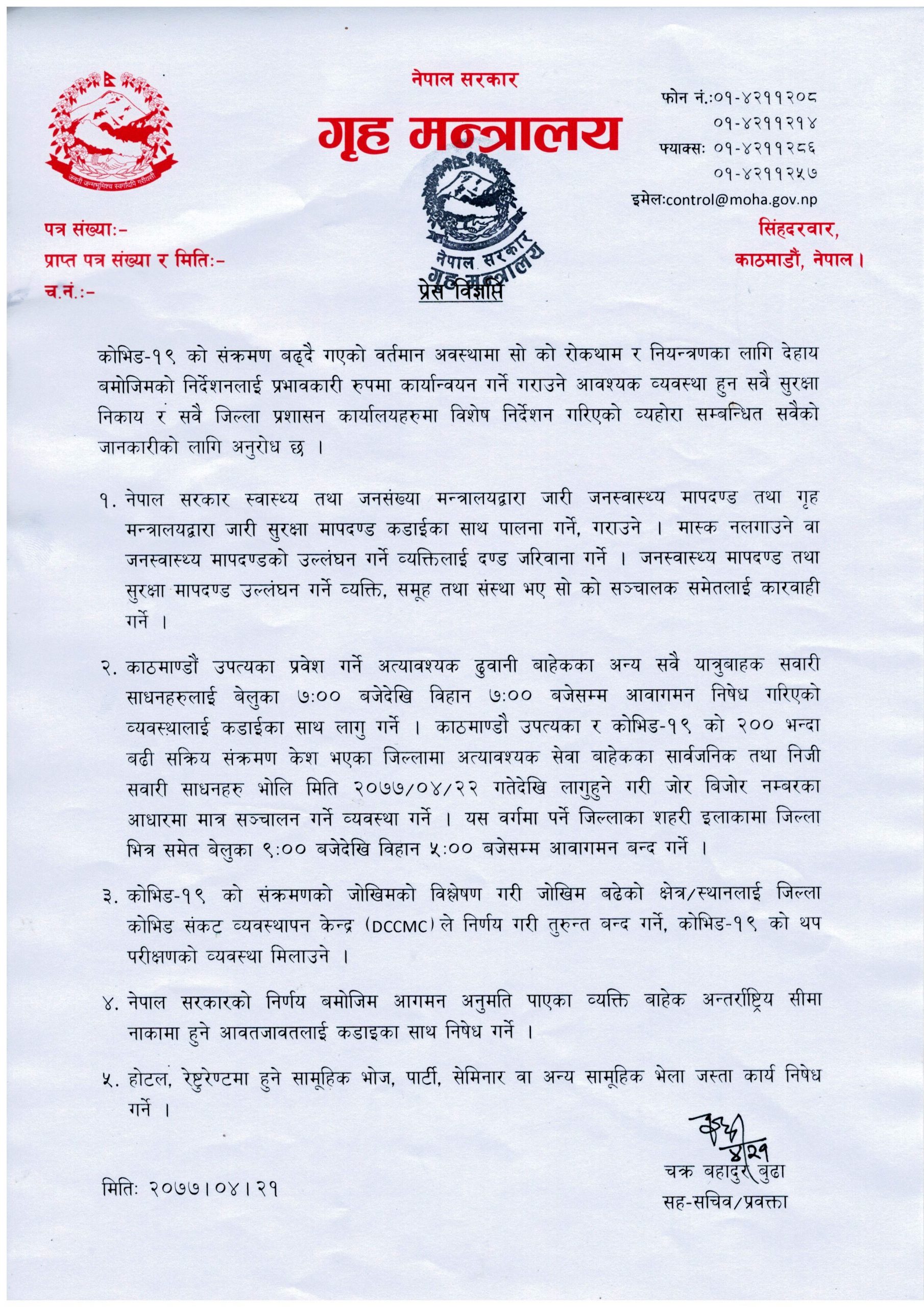 सरकारले २६ असारबाट निजी सवारी साधनको जोर विजोर हटाएको थियो भने उपत्यकामा तीन जिल्ला र बाहिर जिल्लाभित्र सार्वजनिक यातायात सञ्चालन गर्न अनुमति दिएको थियो । यस्तै भदौ १ देखि लामो दुरीको सवारी चलाउन दिने निर्णय गरेको थियो ।