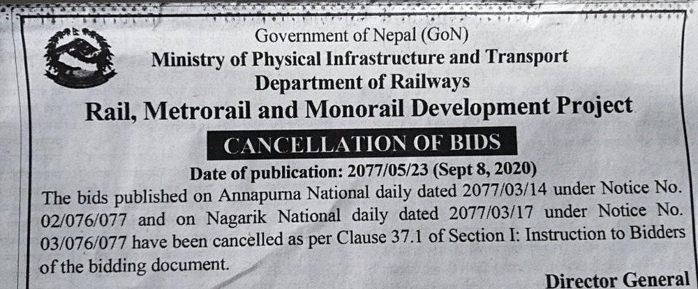 ठेक्का रद्द गरिएको बारे रेल विभागले मंगलबार सार्वजनिक सूचना समेत जारी गरेको छ। भौतिक पूर्वाधार तथा यातायात मन्त्रालय स्रोतले पनि ठेक्का रद्द गरिएको जानकारी दियो। रेलमार्गमा पर्ने बजार क्षेत्रको व्यवस्थापन र उक्त क्षेत्रमा जनताले उपयोग गरेको जग्गाको मुअब्जा वितरण समेत नगरी निर्माणको ठेक्का लगाउनु गलत भएको भन्दै चर्को विरोध भएको थियो ।